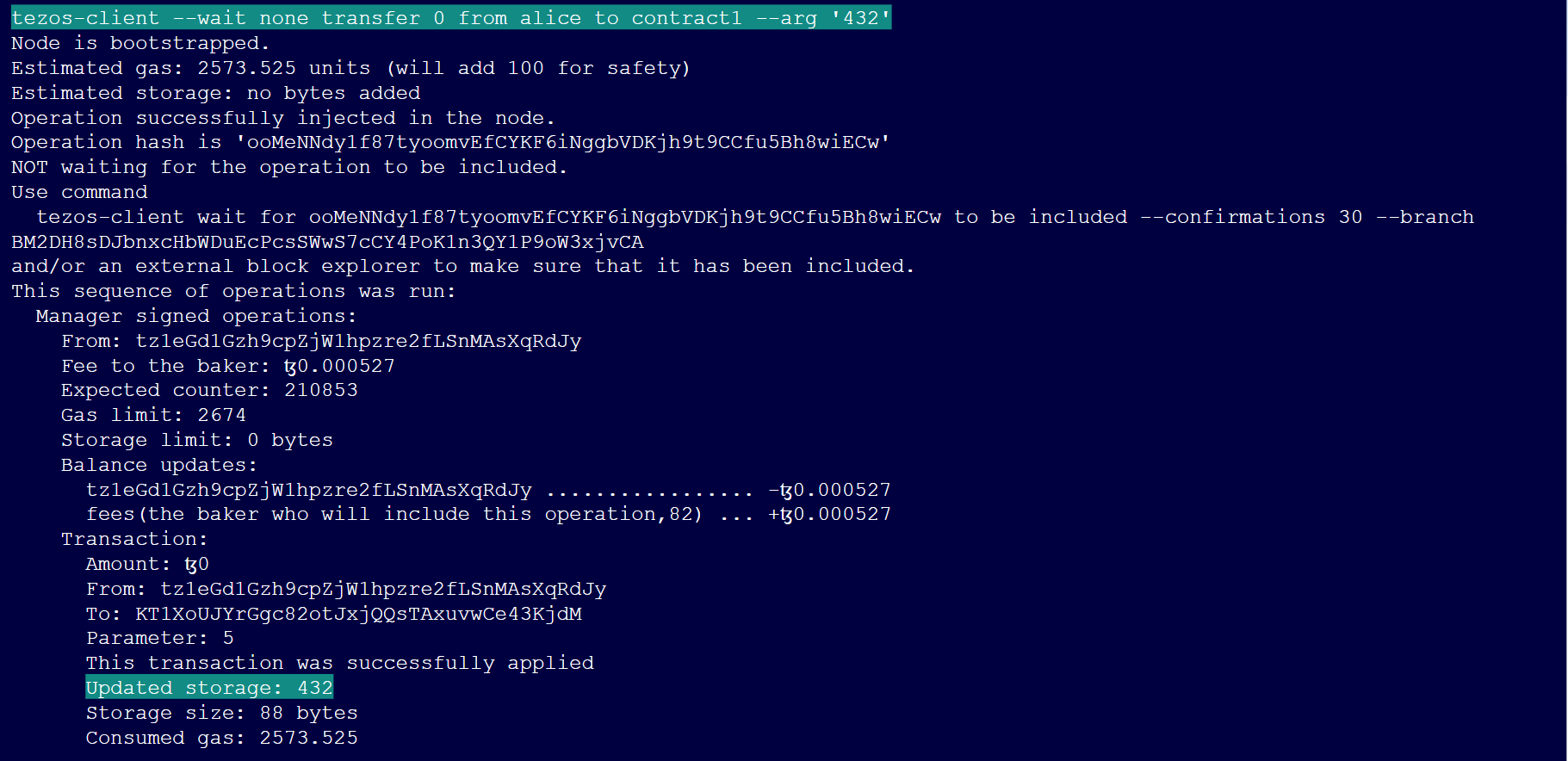 --wait noneindicates that we don't wait for the transaction to be finaltransfer 5indicates that we are sending 5 tez to the contractfrom aliceindicates that the caller address (and sender of the 5 tez) is aliceto contract1indicates the destination of the call: our contract--arg '432'is how we provide the parameter of the contract call